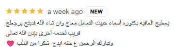A positive review in Arabic praising a doctor's kind manner and quick service, with a five-star rating and a heart emoji at the end.