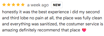 Screenshot of a five-star review praising a piercing experience with Dr. Asma at a piercing center.