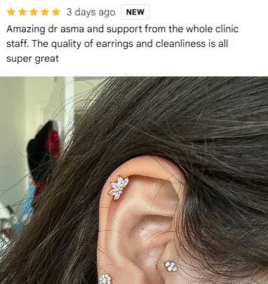 Screenshot of a positive review about Dr. Asma Pressing's clinic and ear piercing experience.